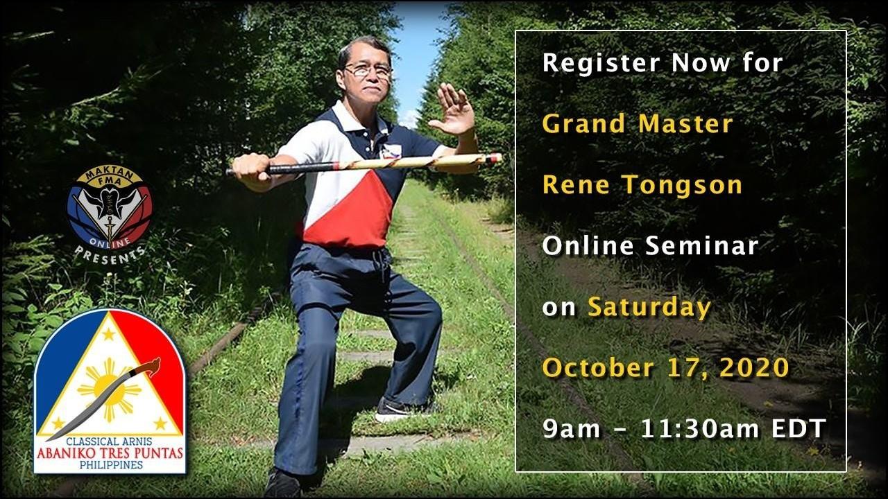 SATURDAY OCTOBER 17, 2020 • 9:00 am - 11:30 am EDT (UTC-4h) – GRAND MASTER RENE TONGSON of Abaniko Tres Puntas Classical Arnis (via live stream)